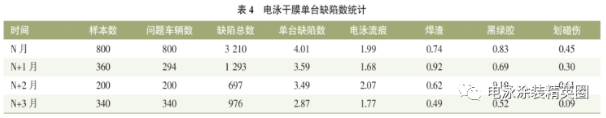 按照以上電泳打磨常見過程質量缺陷對應的分析方法、控制策略,實施并跟蹤3個月,電泳干膜單臺缺陷數及各類型缺陷數均有一定下降,見表3~4所列。