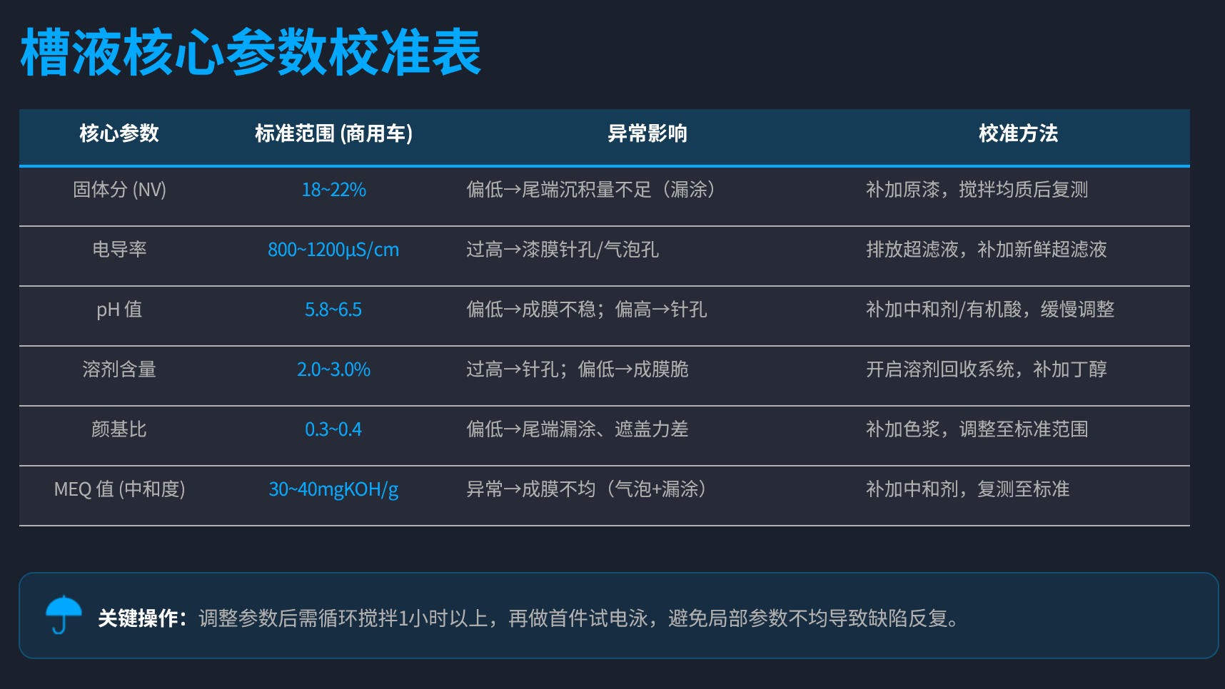 電泳槽液參數異常會導致成膜不均,氣泡孔多與電導率、溶劑含量相關,漏涂則與固體分、顏基比相關,重點校準商用車電泳漆(陰極電泳為主)的核心參數,按標液校準后驗證: